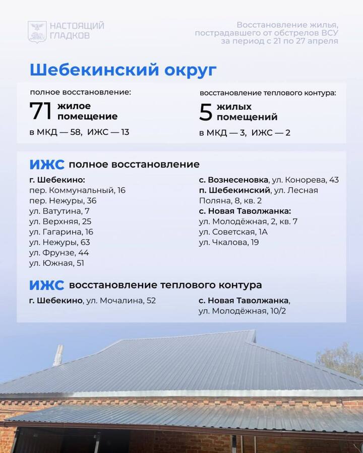 28 апреля губернатор Вячеслав Гладков поделился с жителями Белгородской области обновленным списком адресов, по которым за неделю отремонтировали поврежденное жилье. Информацию глава региона опубликовал в телеграм-канале.