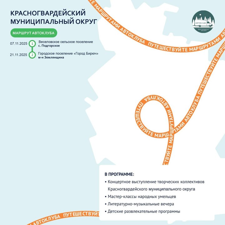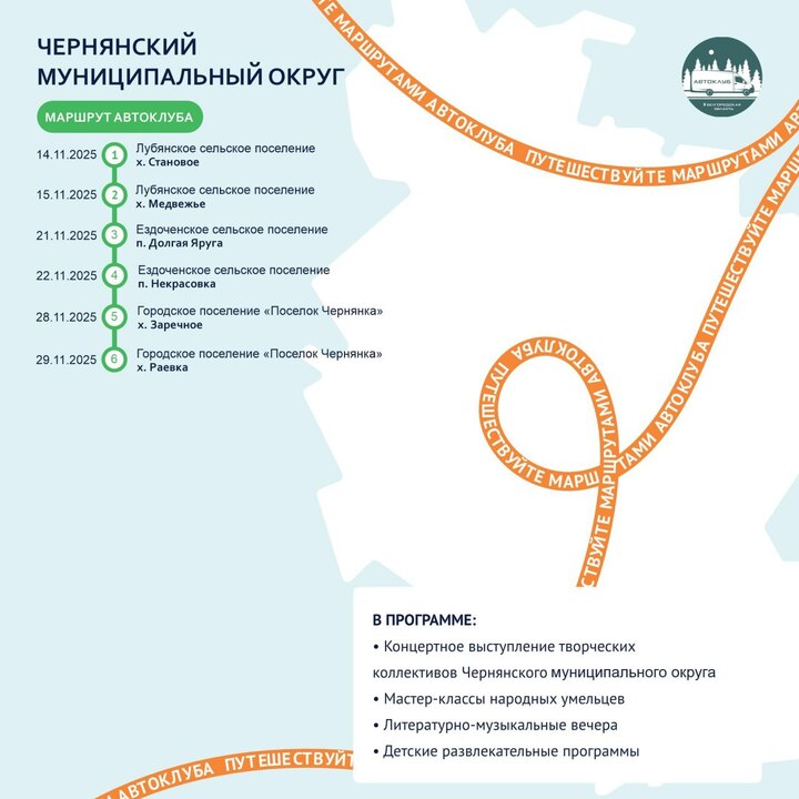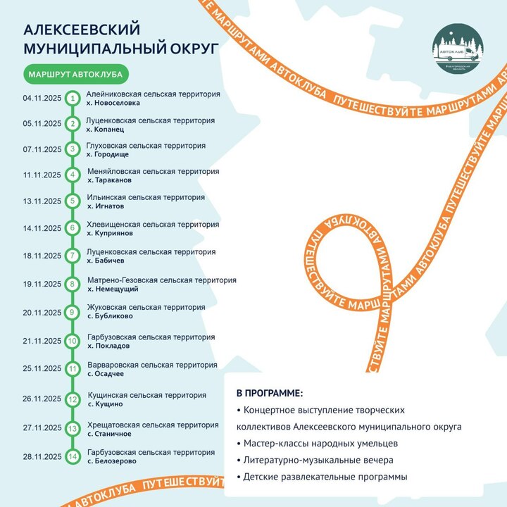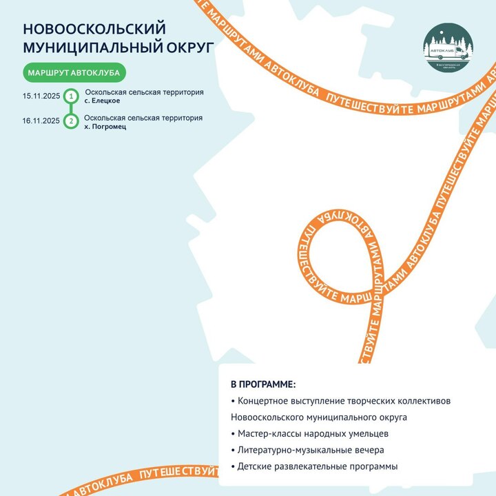 Жителям Белгородской области сообщили расписание автоклубов на ноябрь. Карточки с информацией опубликовали в пресс-службе министерства культуры региона.