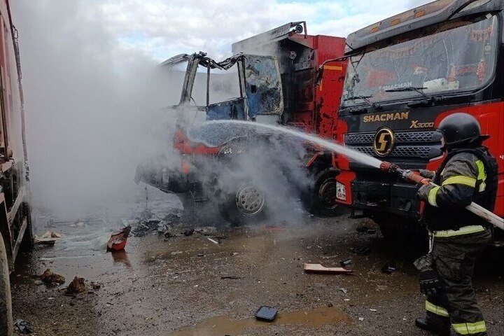 После детонации аппарата загорелись оборудование и два автомобиля – пожарные потушили огонь. Также повреждены навес и еще две легковые машины.