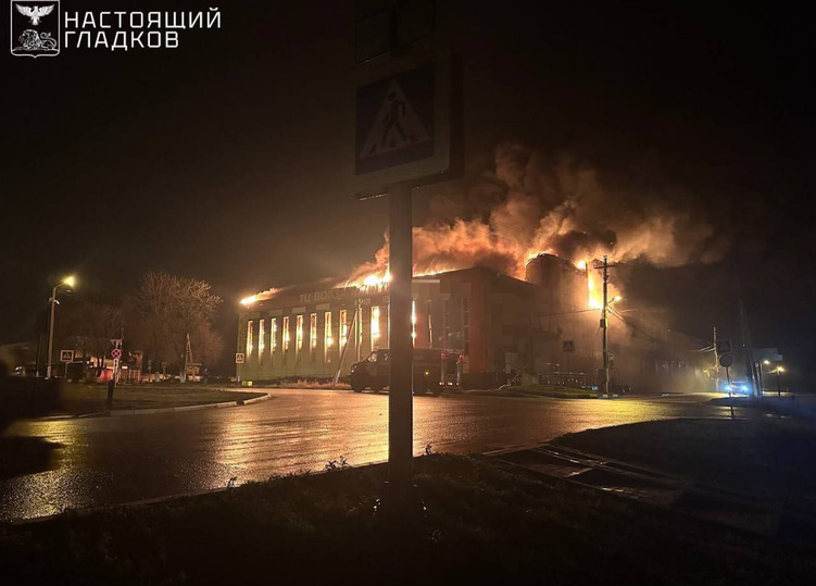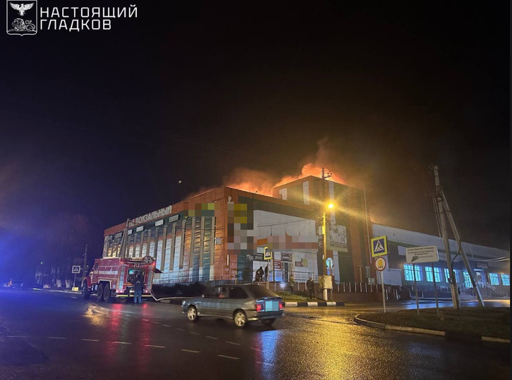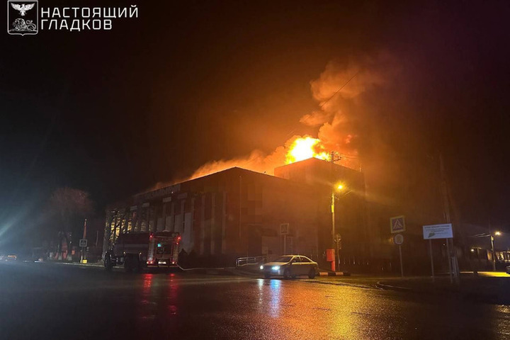 Во время удара загорелась кровля коммерческого объекта. Пожарные тушат очаг возгорания.