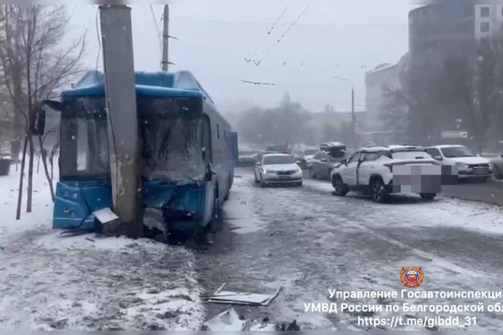 В Белгороде автобус влетел в столб после столкновения с легковушкой, фото: скриншот видео пресс-службы Госавтоинспекции по Белгородской области
