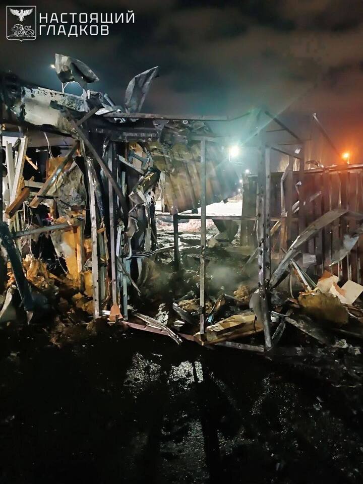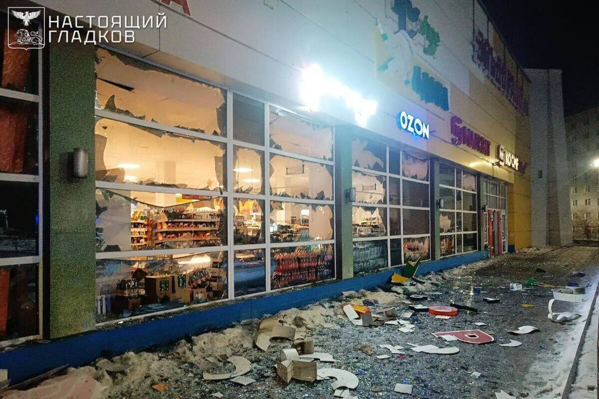 На месте атаки загорелось торговое помещение — спасатели потушили пожар. Также повреждены фасад, остекление коммерческого объекта, а также выбиты окна восьми квартир трех МКД. Осколками посечен автомобиль.