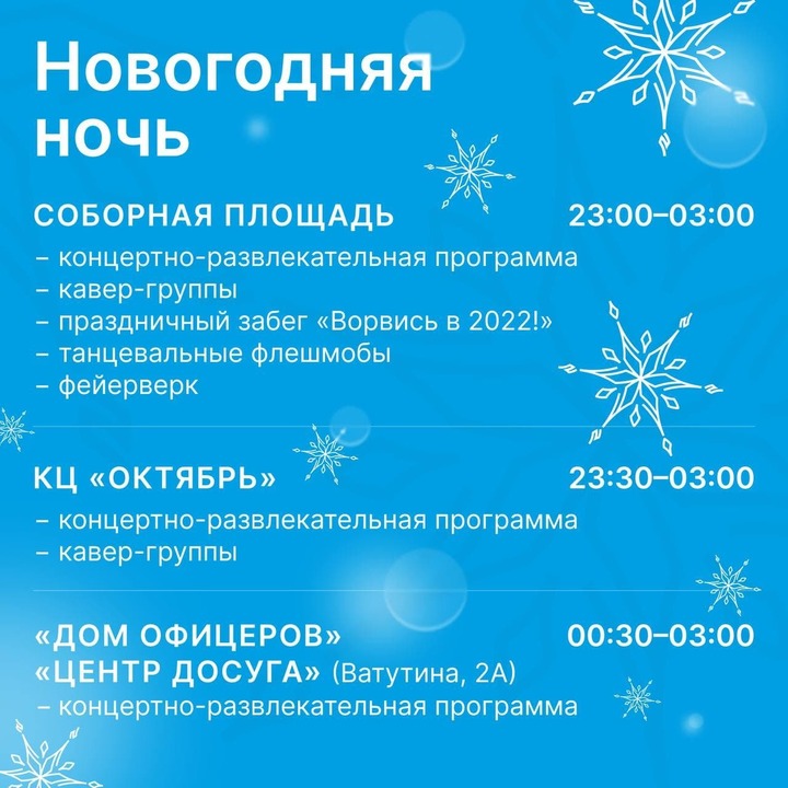 Концертно-развлекательная программа и выступление кавер-группы запланировано и в культурном центре "Октябрь". Мероприятия там пройдут также с 23.00 до 3.00. С 00.30 начнется концерт также в Доме офицеров на Ватутина, 2А.