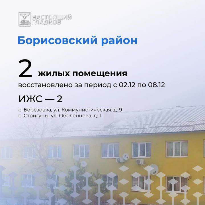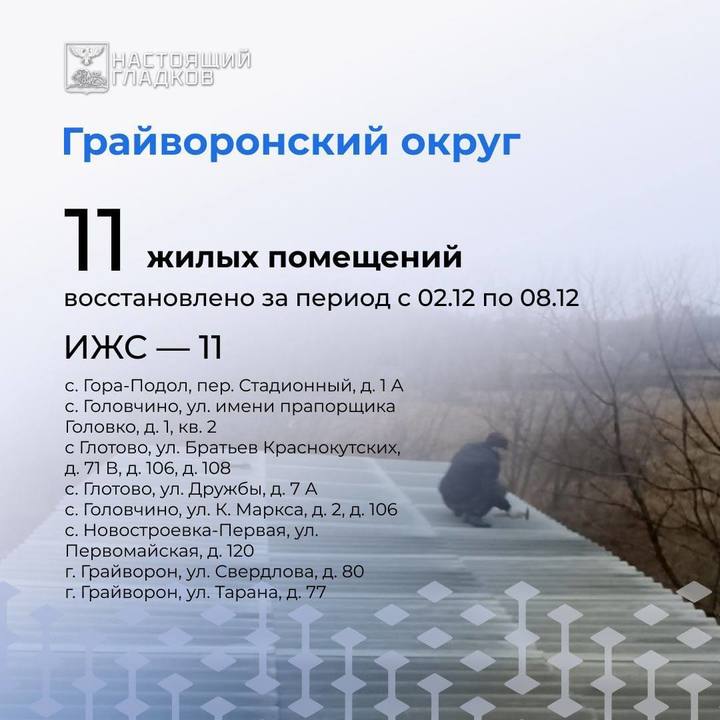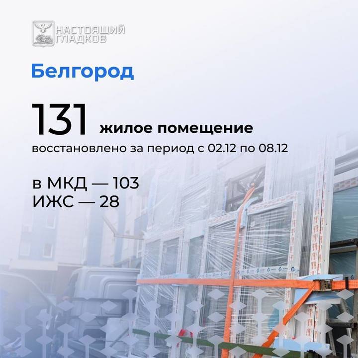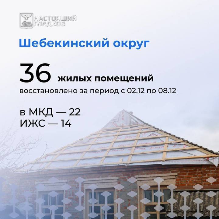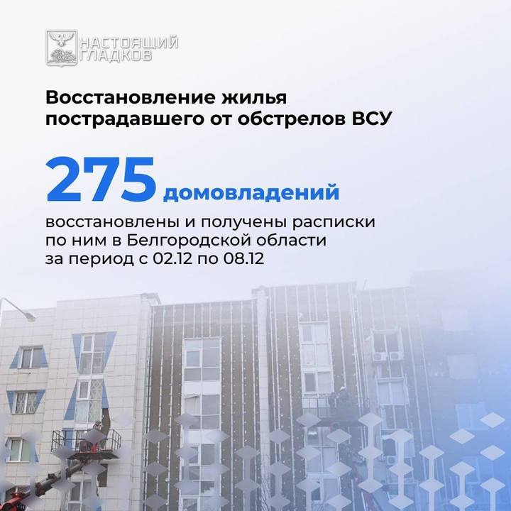 В Белгородской области за неделю восстановили 275 домов и квартир, поврежденных в результате обстрелов со стороны ВСУ. Губернатор Вячеслав Гладков разместил информационные карточки с конкретными адресами по муниципалитетам, на которых с 2 по 8 декабря были выполнены все работы.
