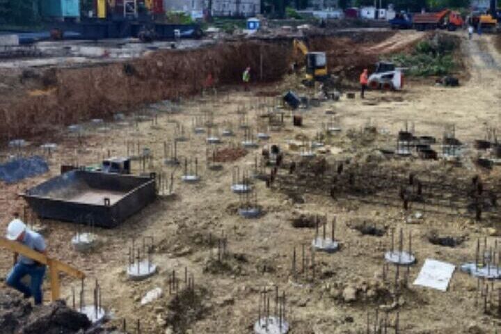 Сейчас специалисты занимаются работами по выносу сетей электроснабжения и водоснабжения. В блоках «А» и «Б» выполнены разработка котлована и устройство буронабивных свай. В блоке «А» подходит к концу монтаж гидроизоляции фундаментов и перекрытия цокольного этажа.