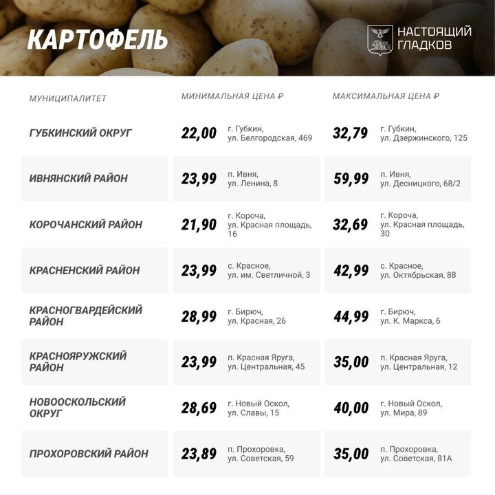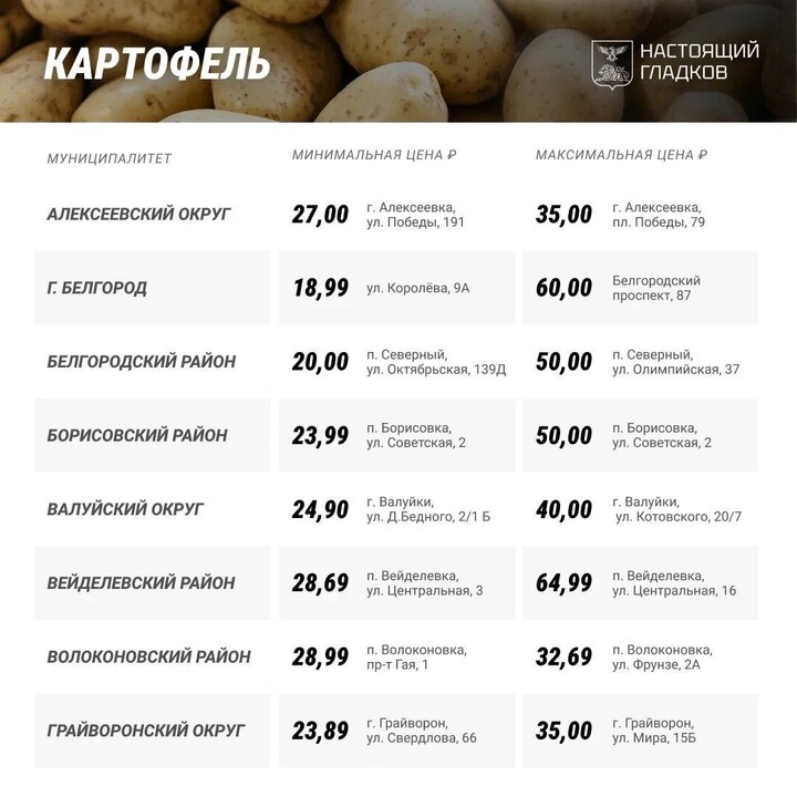 Губернатор Вячеслав Гладков в телеграм-канале сообщил белгородцам цены на картофель в разных торговых точках региона. Он опубликовал карточки с минимальной и максимальной стоимостью товара за 1 кг в разных муниципалитетах. Информация актуальна на 14 октября 2025 года.