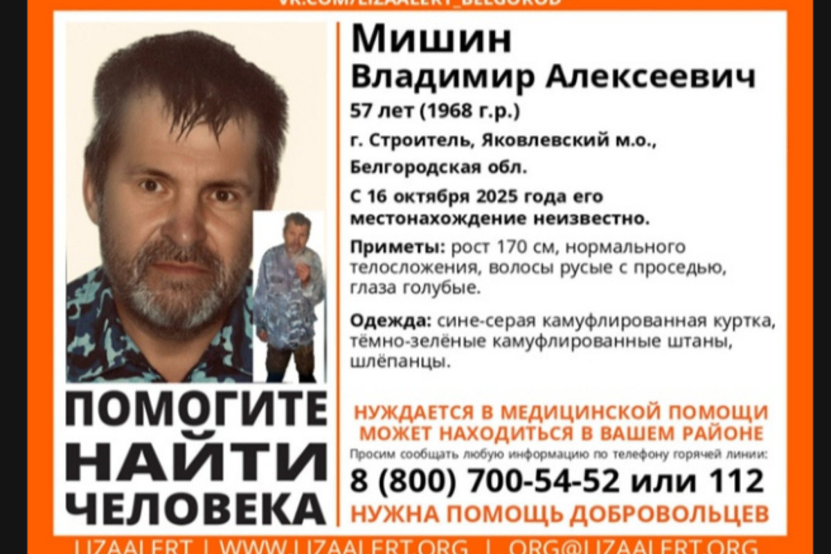 В Белгородской области пропал 57-летний мужчина из Строителя – Владимир Алексеевич Мишин. С 16 октября его местонахождение неизвестно.