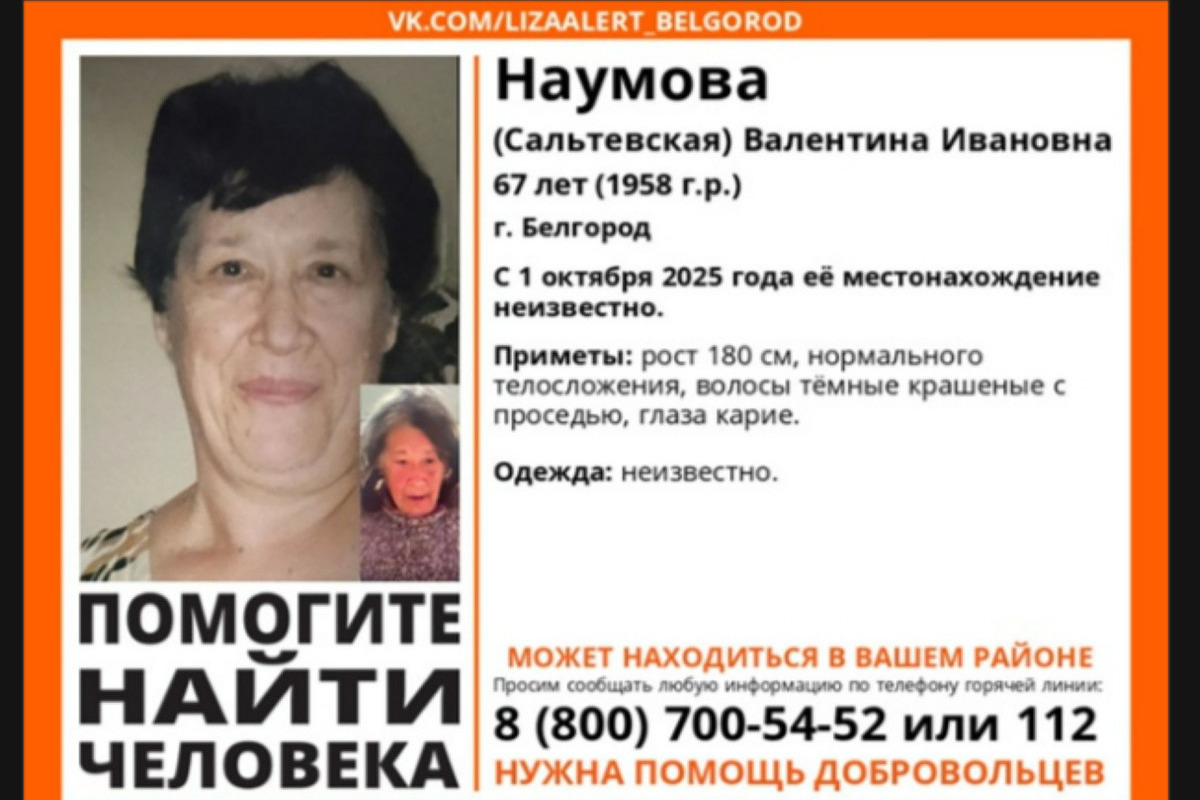 В Белгороде пропала 67-летняя женщина – Валентина Ивановна Наумова (Сальтевская). С 1 октября 2025 года ее местонахождение неизвестно.