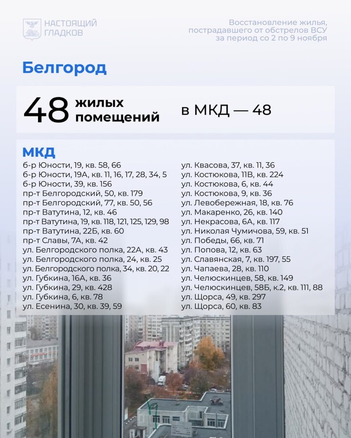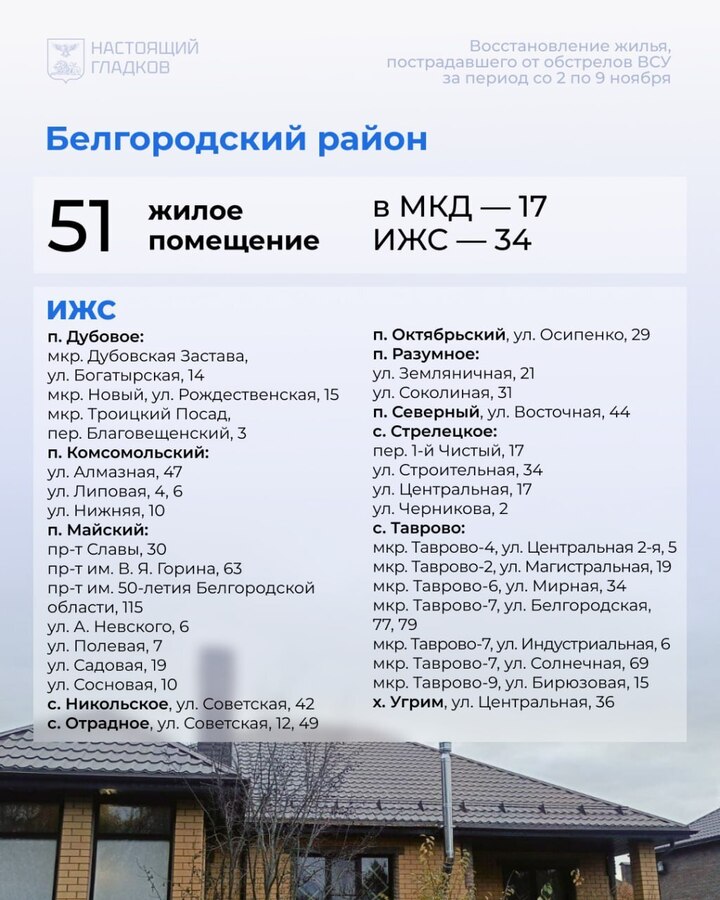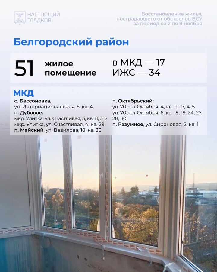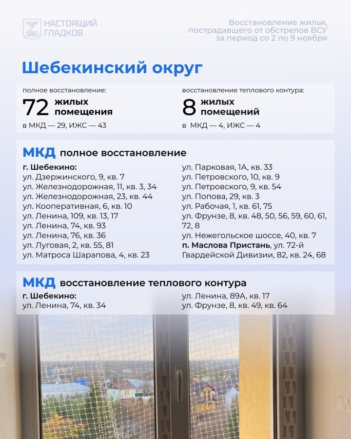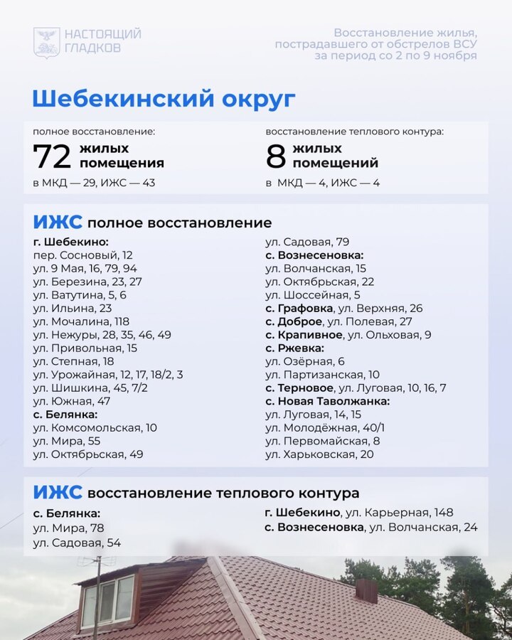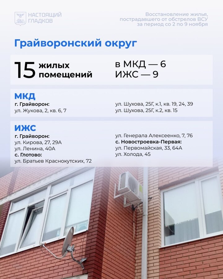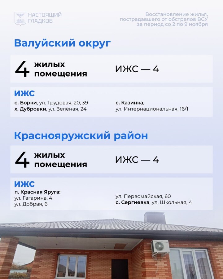 В Белгородской области со 2 по 9 ноября восстановили 194 жилых объекта, пострадавших при атаках ВСУ. Карточки с адресами опубликовал губернатор Вячеслав Гладков в соцсетях.