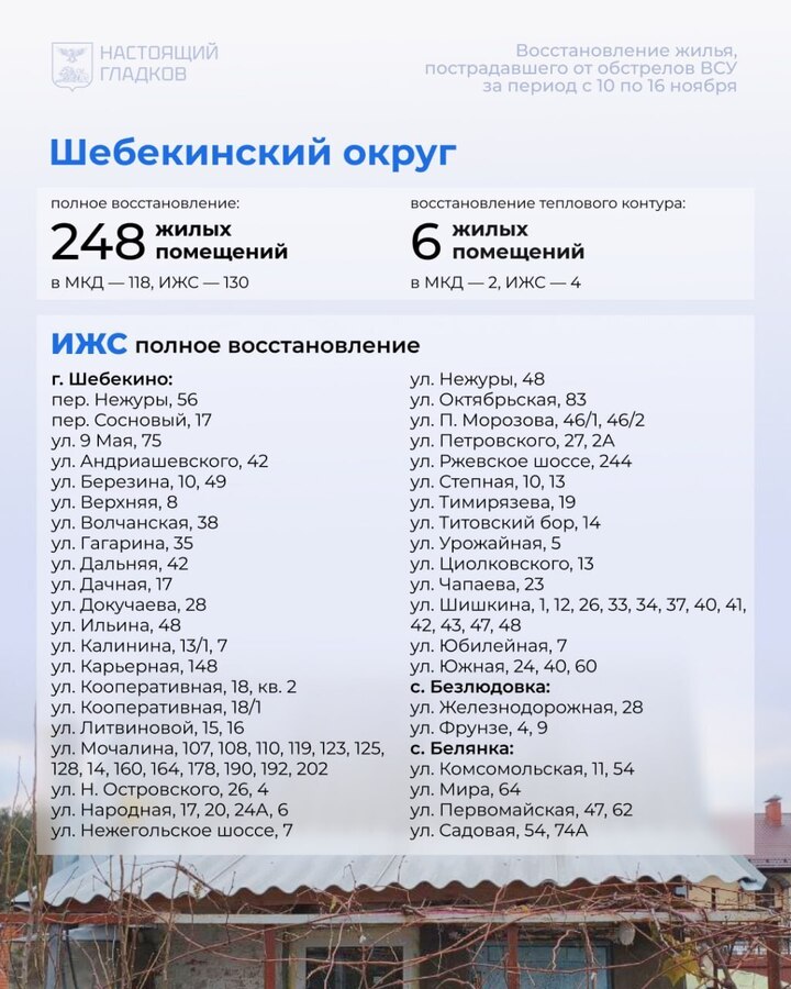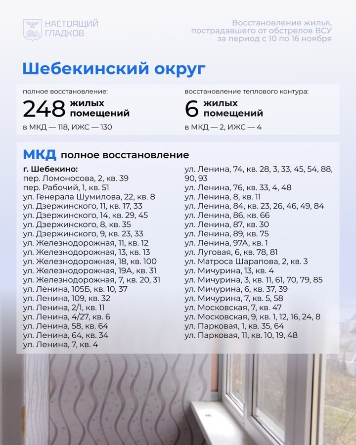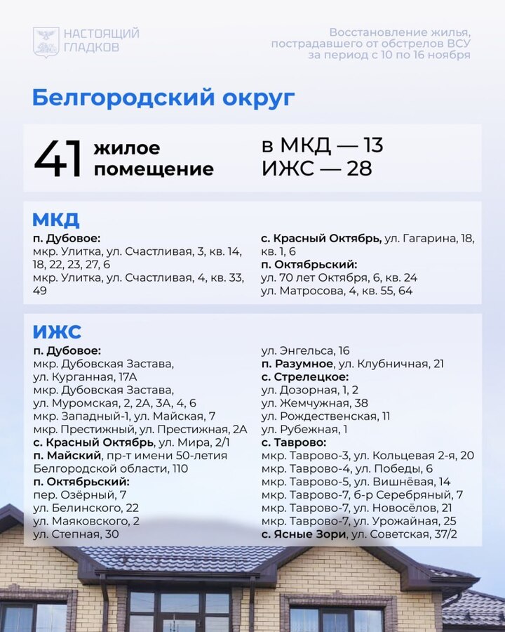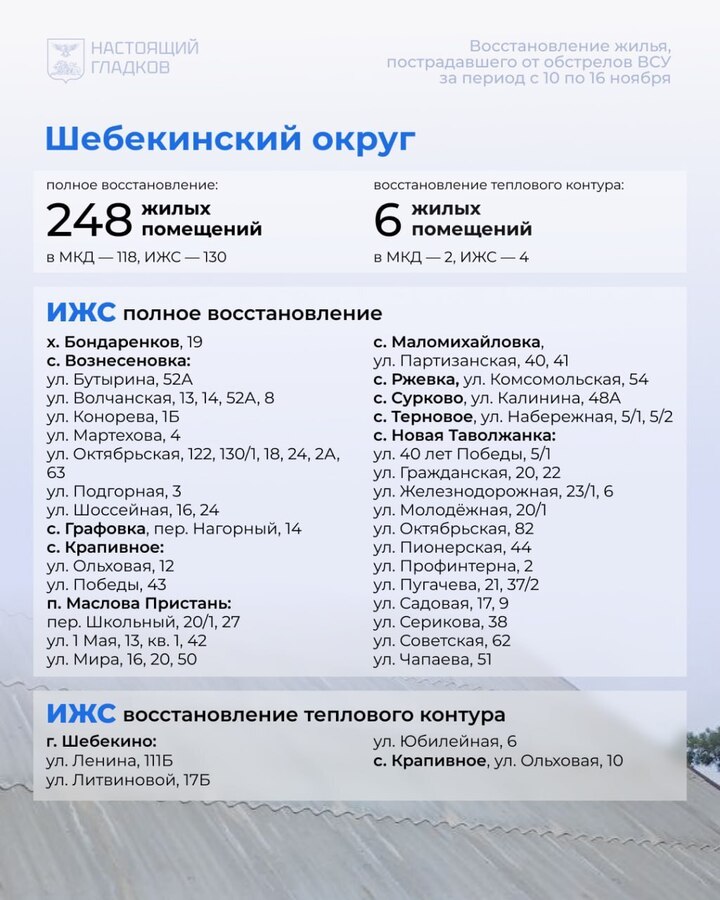 В Белгородской области с 10 по 16 ноября восстановили 389 домов и квартир, поврежденных при атаках ВСУ. Список адресов разместил глава региона Вячеслав Гладков в соцсетях.