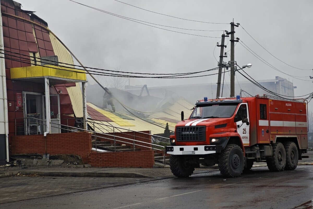 В городе Короча Белгородской области после атаки беспилотников полностью сгорели три коммерческих здания. Сейчас огнеборцы завершают работы по ликвидации пожара и разбирают разрушенные конструкции торговых объектов.