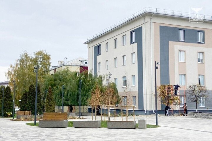 На территории сделали зоны для активного отдыха, проведения массовых мероприятий и спокойного досуга с зелеными насаждениями, комфортными лавочками. Специалисты уложили тротуарную плитку и покрытие дорожек, обновили фонтан, оборудовали системы освещения и видеонаблюдения, установили пандусы, сделали удобную навигацию, освещение.