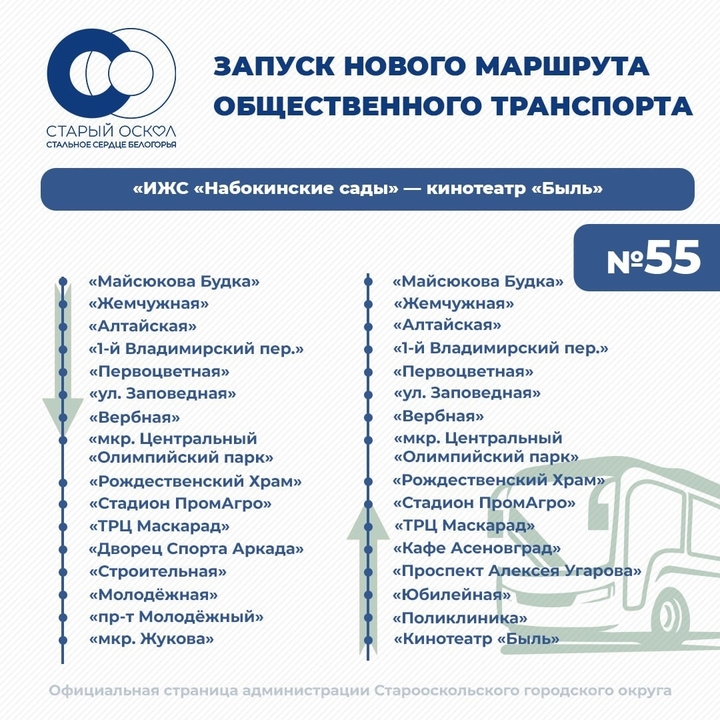 Жителям Старого Оскола Белгородской области сообщили о запуске нового автобусного маршрута № 55. Движение по маршруту стартует с 24 ноября.
