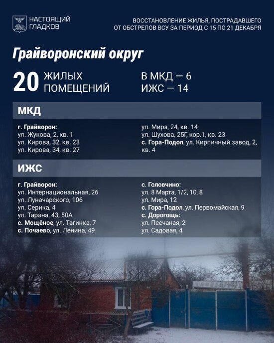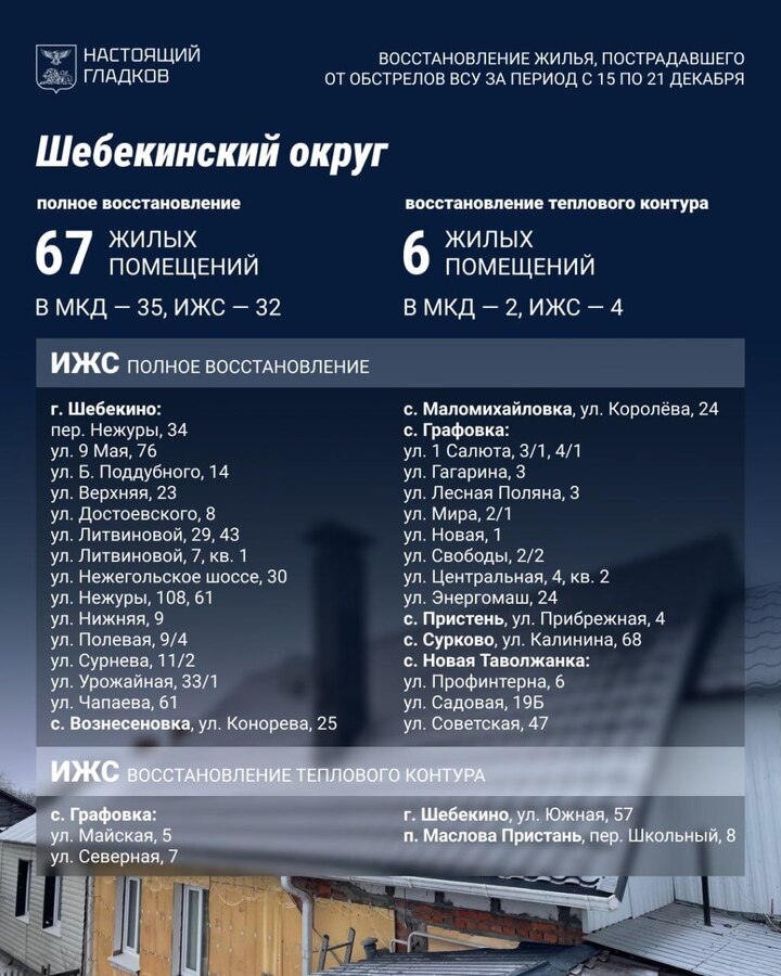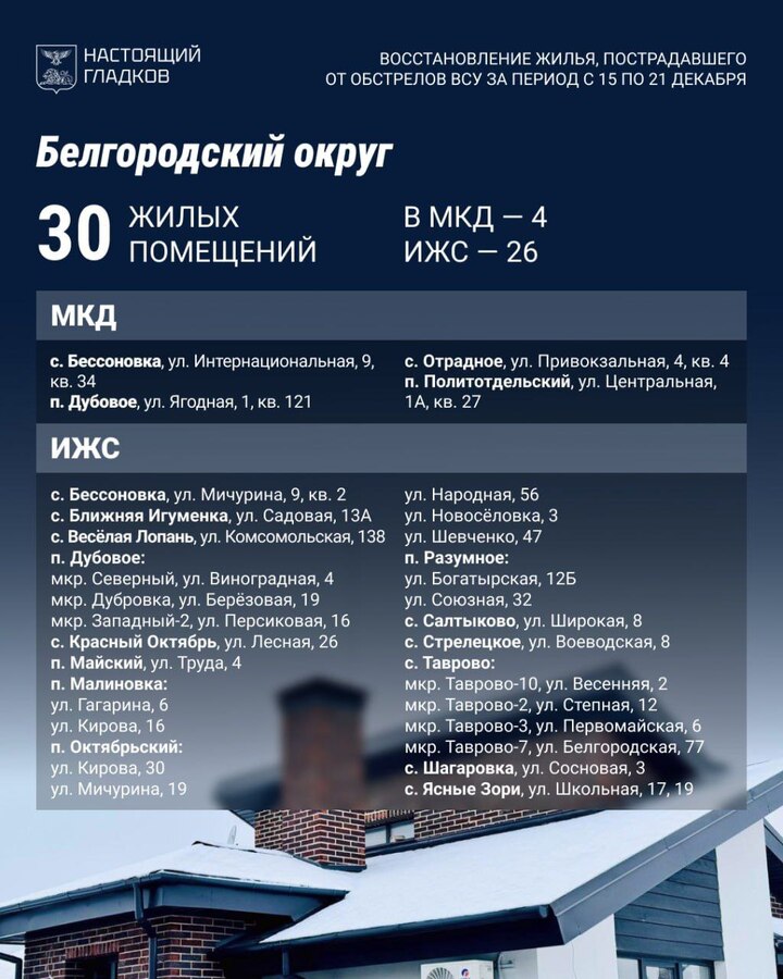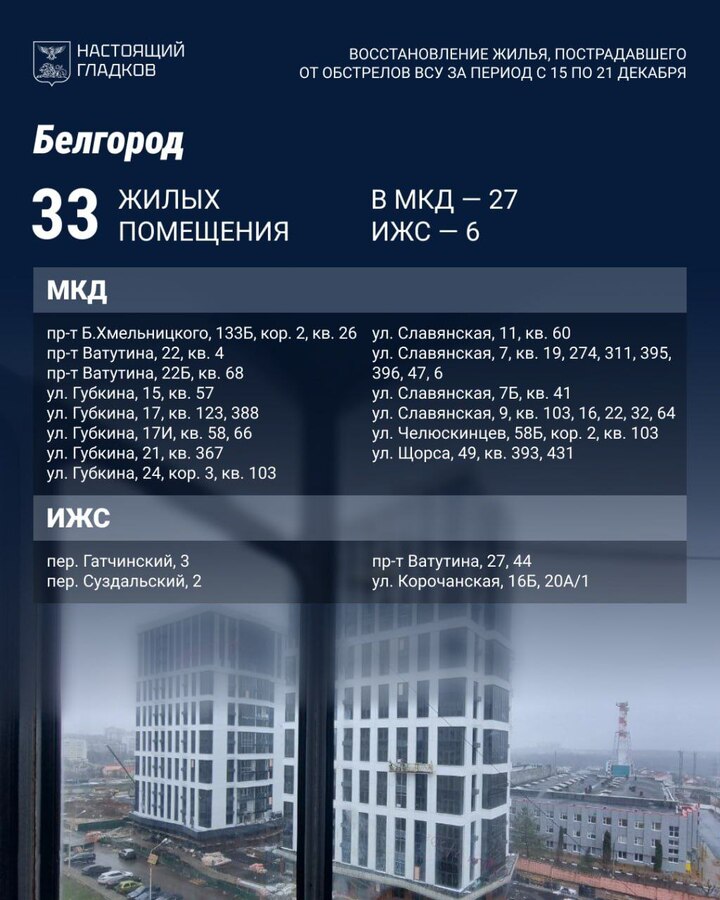 В Белгородской области с 15 по 21 декабря восстановили 177 жилых объектов. Список с адресами разместил на своих страницах в соцсетях губернатор Вячеслав Гладков.