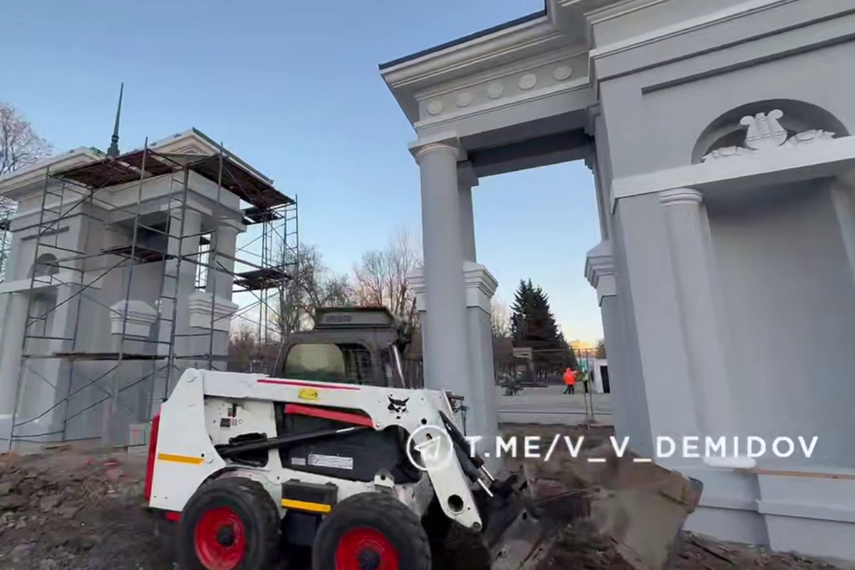 В Центральном парке Белгорода частично убирают строительное ограждение арки, фото: скриншот видео со страницы t.me/v_v_demidov