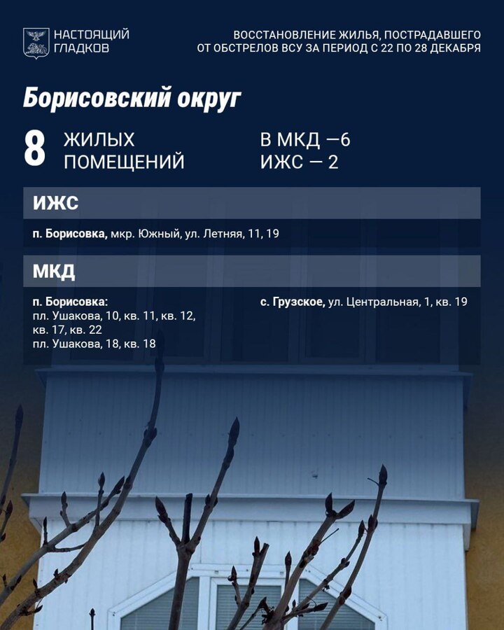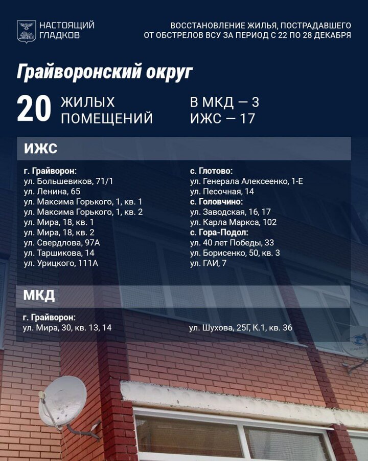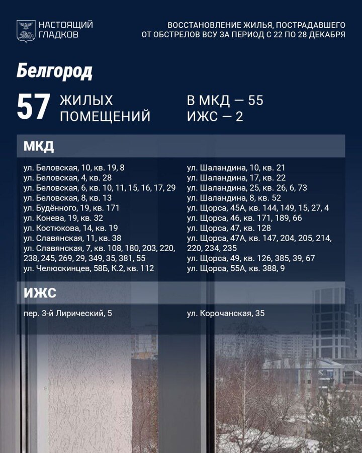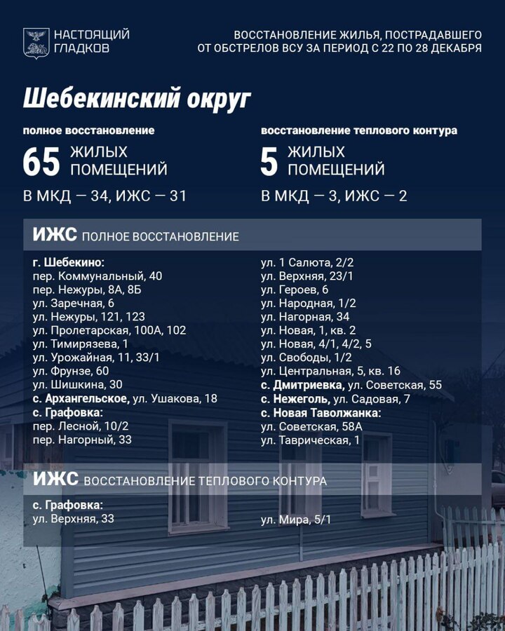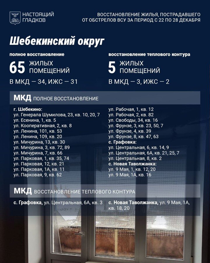 В Белгородской области с 22 по 28 декабря восстановили 187 домов и квартир. Перечень адресов, где завершили работы, разместил на своих страницах в соцсетях губернатор Вячеслав Гладков.