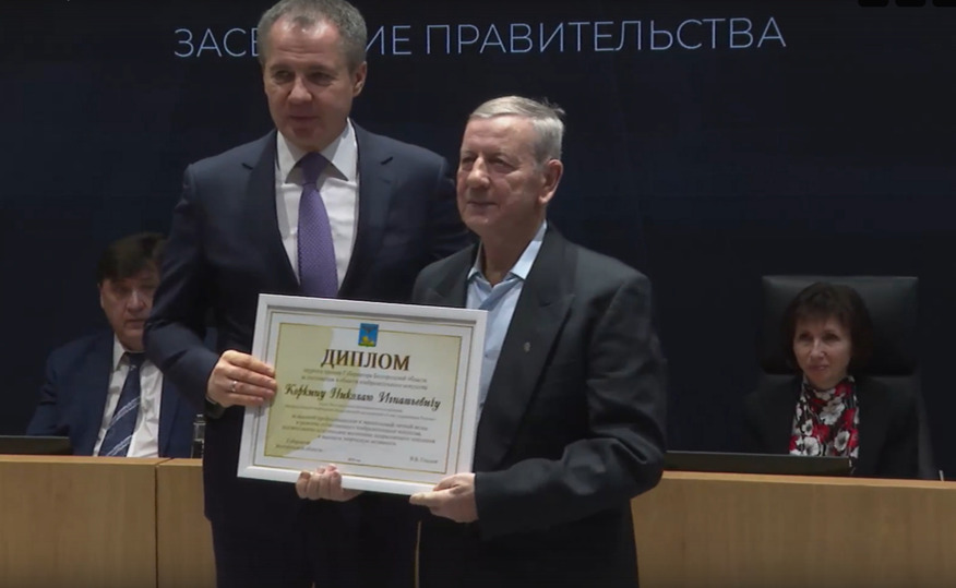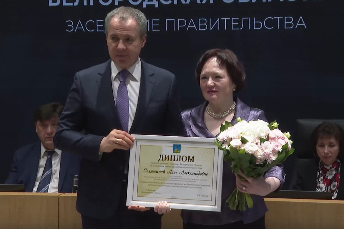 29 декабря еженедельное заседание правительства Белгородской области началось с церемонии награждения за достижения в сфере изобразительного искусства в 2025 году. Губернатор Вячеслав Гладков вручил дипломы лауреатов и сертификаты на получение денежной премии ученому секретарю, заведующей отделом развития Белгородского художественного музея Алле Селютиной и члену белгородского отделения Всероссийской творческой общественной организации «Союз художников России» Николаю Коркину.