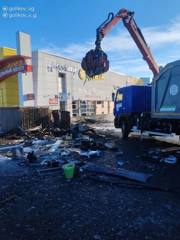 Специалисты уже закрыли тепловые контуры, убрали «свисающие» стекла, вывезли сгоревшие/поврежденные НТО (ларьки), навели порядок на парковке ТЦ, а также разместили памятки для жителей в подъездах.